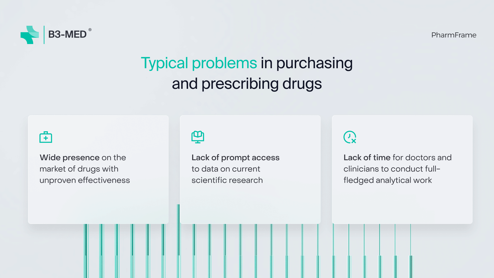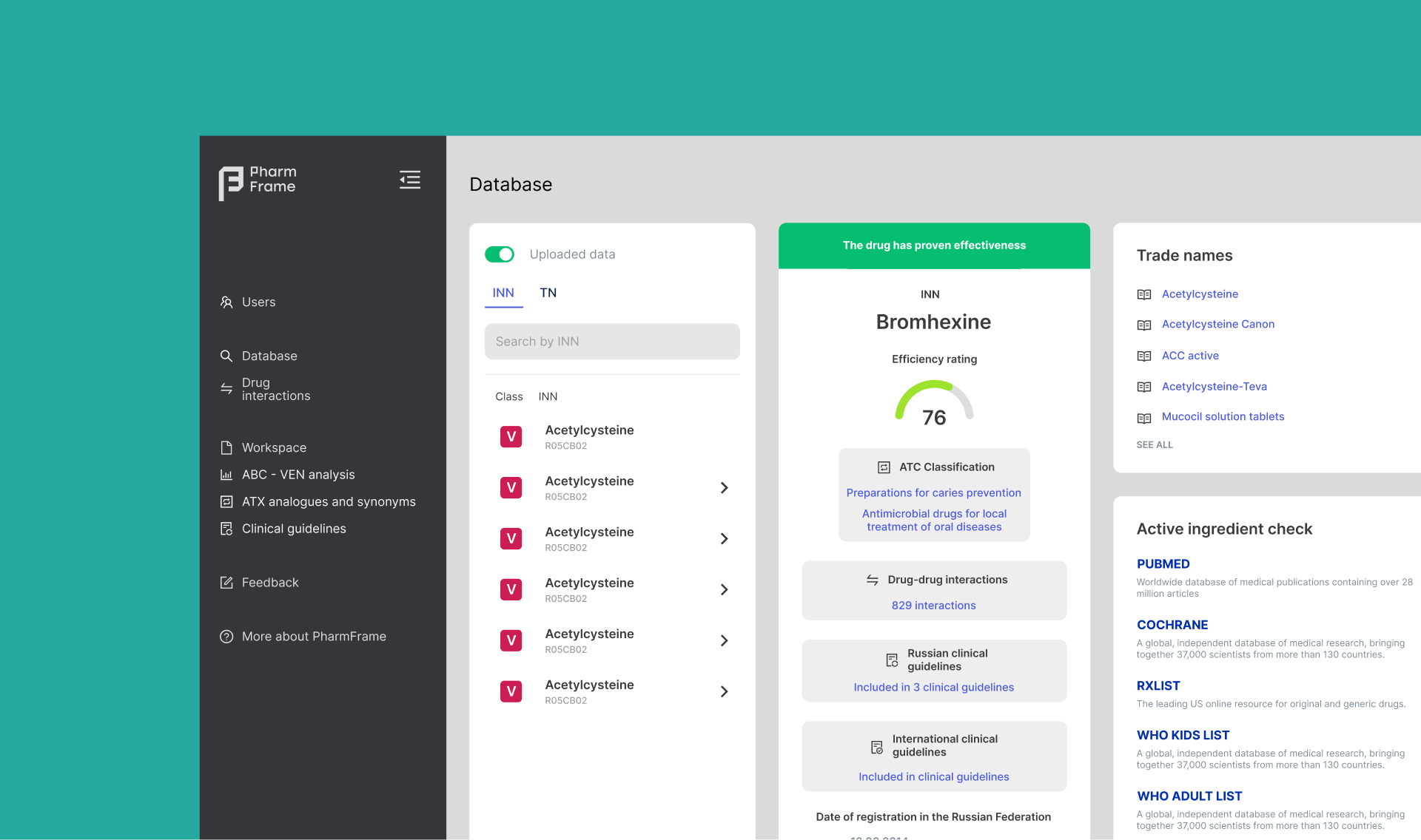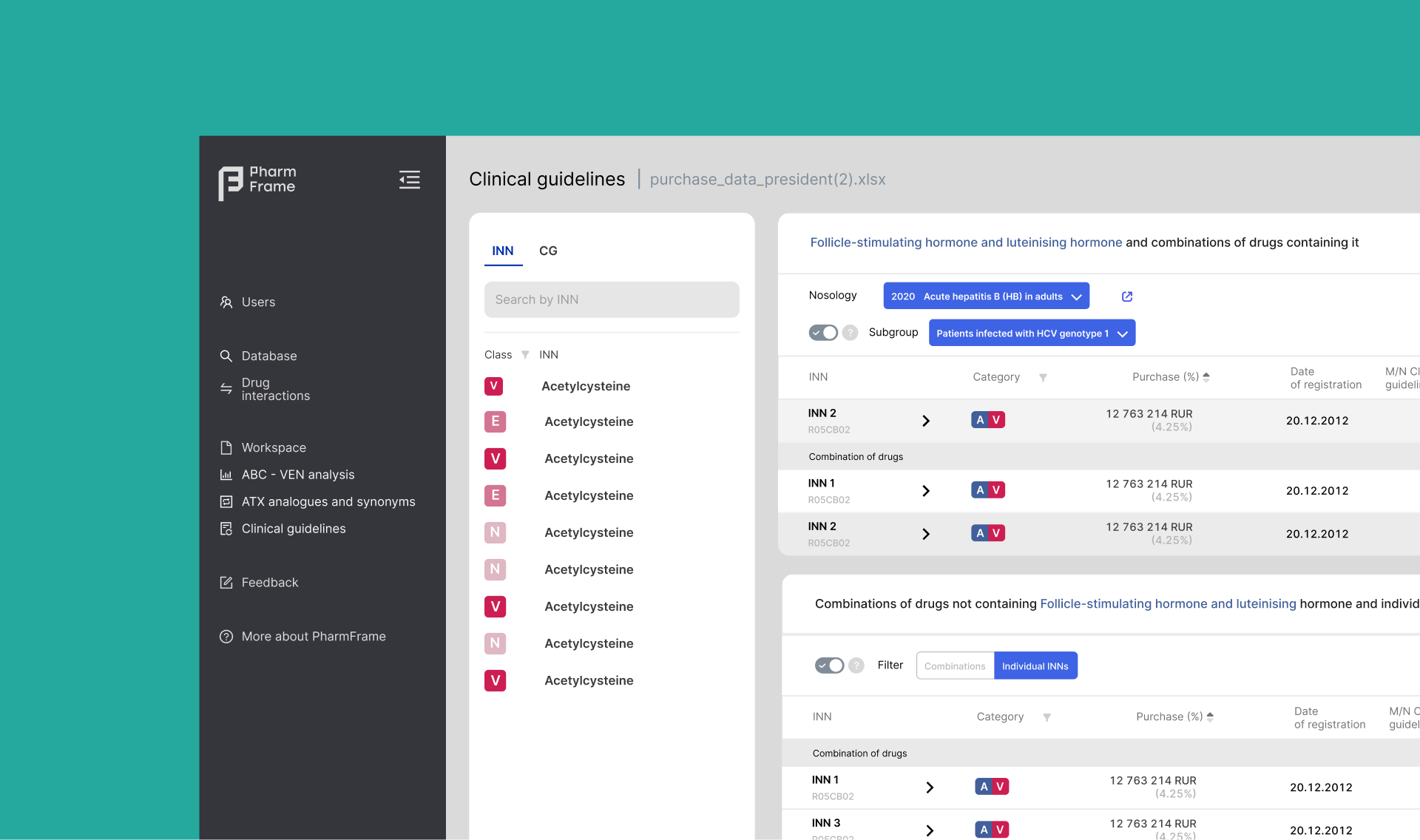 PharmFrame automates ABC-VEN analysis when purchasing medicines and performs analytical work when selecting medicines for patients. The solution assists administrative staff at pharmacies and medical institutions, as well as attending physicians and clinicians. The PharmFrame database includes all drugs registered in the Russian Federation. The PharmFrame methodology has been verified by doctors of various specialties over the past 5 years.