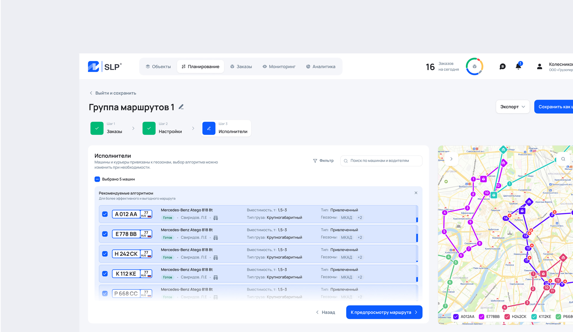 Система выбирает маршрут в зависимости от типа доставщика, его загрузки и местоположения. Алгоритмы маршрутизации и планирования SLP превосходят по скорости и эффективности многие аналоги на рынке решений для логистики